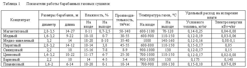 Показатели работы барабанных газовых сушилок см. в Таблице 1.